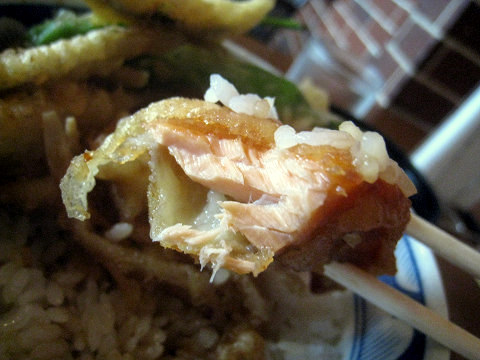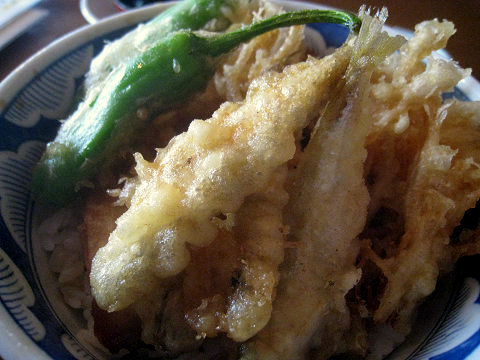 ワカサギ、ニジマス、ゴボウ、シシトウ、な天丼です。