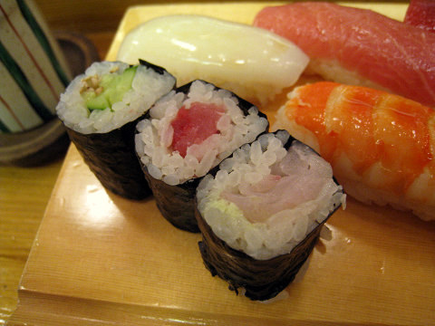 1575円のにぎりずしは「イカ、トロ、赤身、タイ(?)、細巻き(イカ、鉄火、キュウリ)、エビ、玉子、穴子」の計7貫3巻。。。