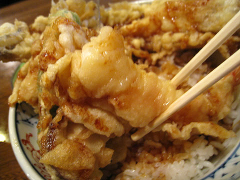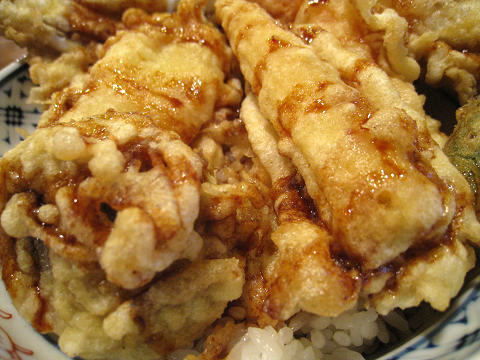 上天丼は「エビ、キス、アスパラ、ヤングコーン、メゴチ、穴子、あと何かあったっけな?」入り。