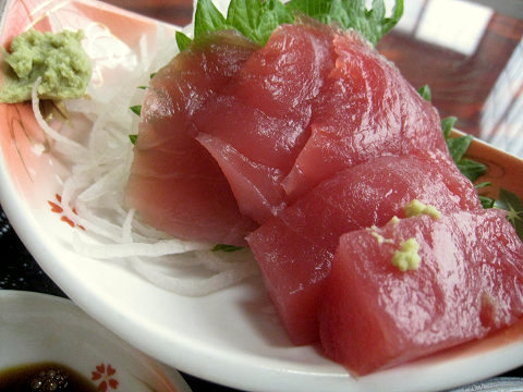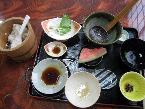 「秋葉」は「とろろ汁、麦めし、小鉢、漬物、吸物、フルーツ、さしみ、揚げとろ」な一品。