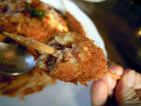 半熟玉子のオムライスは、半熟オムレツが花開いた系のオムライスに串に刺さったメンチカツが2つ乗っています。。。