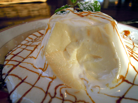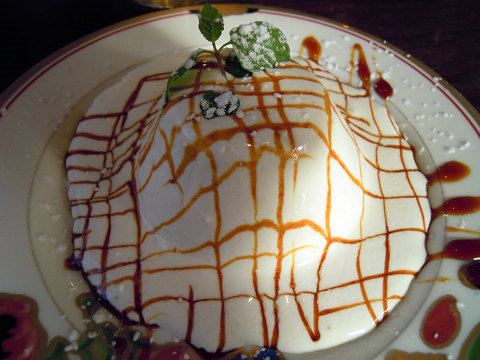 生クリーム、カラメルソース、粉砂糖がかかっています。